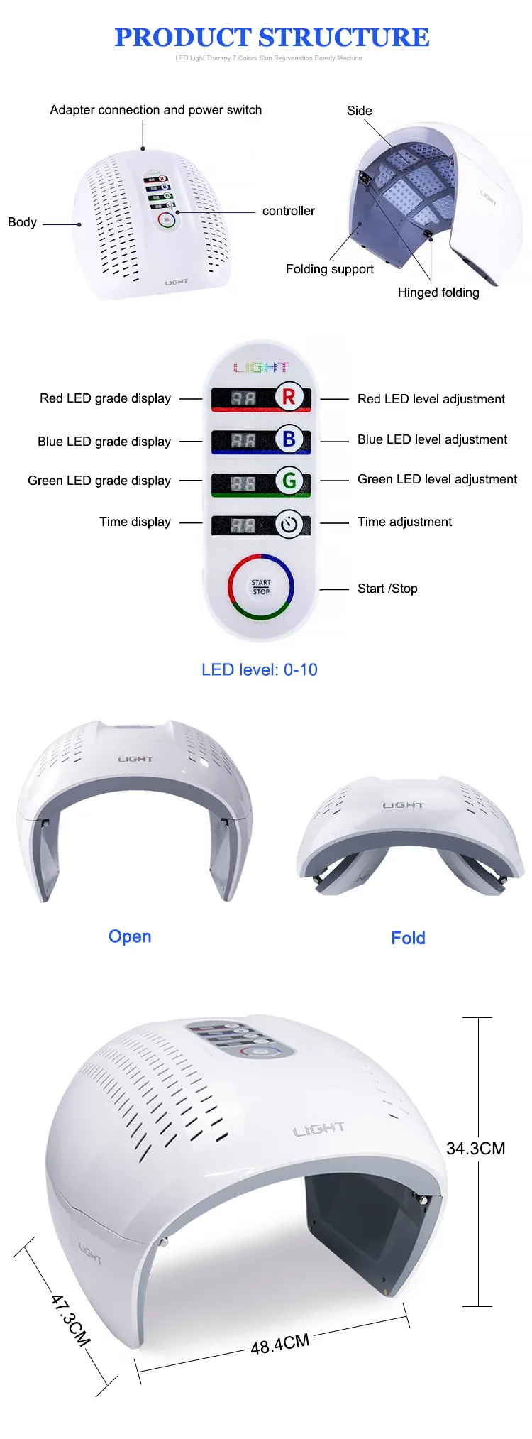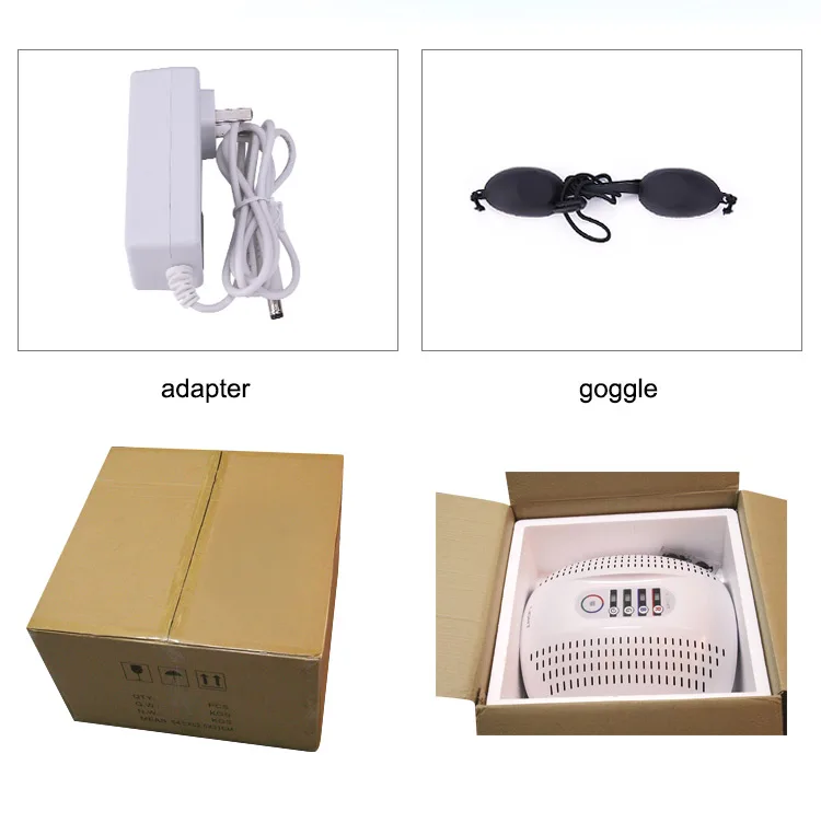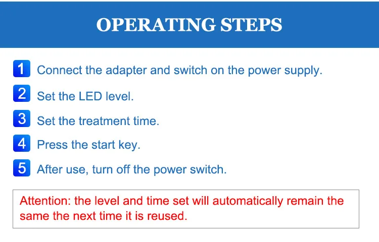 Operating steps 1. Connect the adapter and switch on the power supply. 2. Set the LED level. 3. Set the treatment time. 4. Press the start key. 5. After use, turn off the power switch. Attention: the level and time settings will automatically remain the same the next time it is reused.