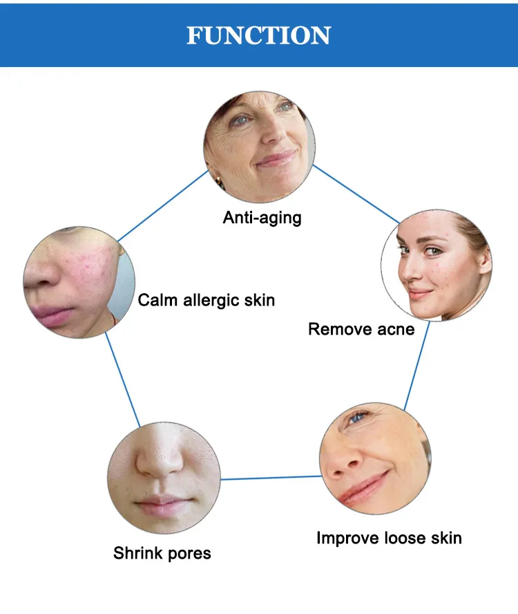 Function 1. Shrink pores. 2. Improve loose skin. 3. Calm allergic skin. 4. Remove acne. 5. Anti-aging.